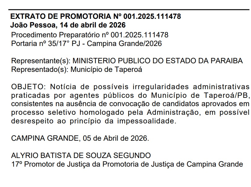 De acordo com a portaria publicada pela Promotoria de Justiça de Campina Grande, a apuração envolve denúncias sobre a falta de convocação de candidatos aprovados em processo seletivo já homologado pela gestão municipal.